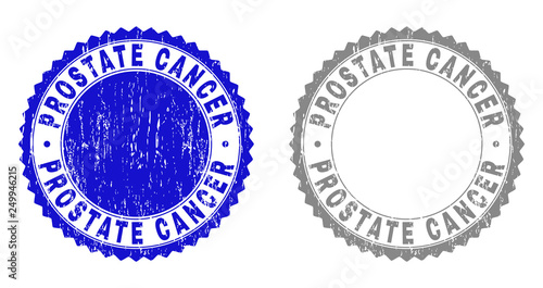 Grunge PROSTATE CANCER stamp seals isolated on a white background. Rosette seals with grunge texture in blue and gray colors. Vector rubber watermark of PROSTATE CANCER caption inside round rosette.