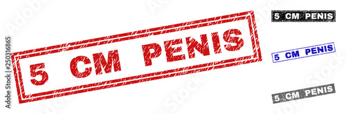 Grunge 5 CM PENIS rectangle stamp seals isolated on a white background. Rectangular seals with grunge texture in red, blue, black and gray colors.