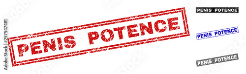 Grunge PENIS POTENCE rectangle stamp seals isolated on a white background. Rectangular seals with grunge texture in red, blue, black and gray colors.