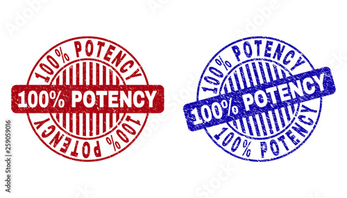 Grunge 100% POTENCY round stamp seals isolated on a white background. Round seals with grunge texture in red and blue colors.