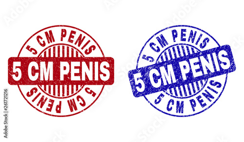 Grunge 5 CM PENIS round stamp seals isolated on a white background. Round seals with grunge texture in red and blue colors. Vector rubber watermark of 5 CM PENIS tag inside circle form with stripes.