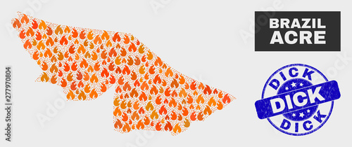 Vector collage of flamed Acre State map and blue rounded distress Dick seal stamp. Fiery Acre State map mosaic of flame symbols. Vector collage for insurance services, and Dick seal stamp.