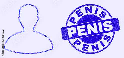 Geometric person mosaic pictogram and Penis seal stamp. Blue vector rounded grunge stamp with Penis caption. Abstract mosaic of person created of circle, tringle, square geometric items.