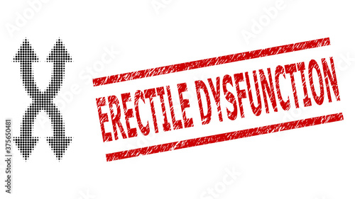 Shuffle arrows vertical halftone dotted vector and Erectile Dysfunction corroded stamp imitation. Stamp includes Erectile Dysfunction caption between parallel lines.