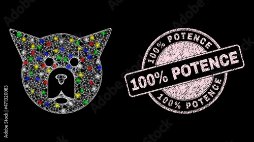 Glossy hatched net mesh dog head icon with glitter effect on a black background with 100% Potence grunge seal print. Pink stamp seal includes 100% Potence text inside round form.