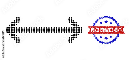 Halftone stretch arrows icon, and bicolor scratched Penis Enhancement seal. Halftone stretch arrows icon is designed with small circle items. Vector seal with unclean bicolored style,