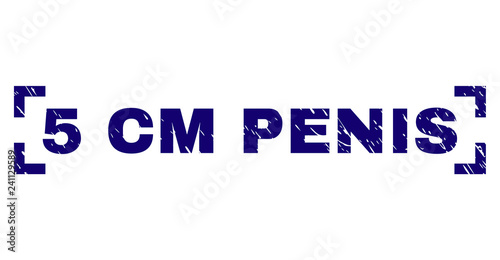5 CM PENIS tag seal print with corroded effect. Text tag is placed inside corners. Blue vector rubber print of 5 CM PENIS with dust texture.