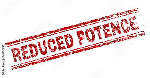 REDUCED POTENCE seal print with corroded texture. Red vector rubber print of REDUCED POTENCE text with corroded texture. Text label is placed between double parallel lines.