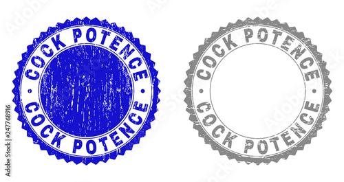 Grunge COCK POTENCE stamp seals isolated on a white background. Rosette seals with grunge texture in blue and gray colors. Vector rubber watermark of COCK POTENCE tag inside round rosette.