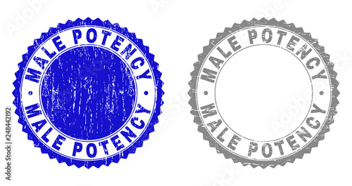 Grunge MALE POTENCY stamp seals isolated on a white background. Rosette seals with grunge texture in blue and grey colors. Vector rubber overlay of MALE POTENCY text inside round rosette.