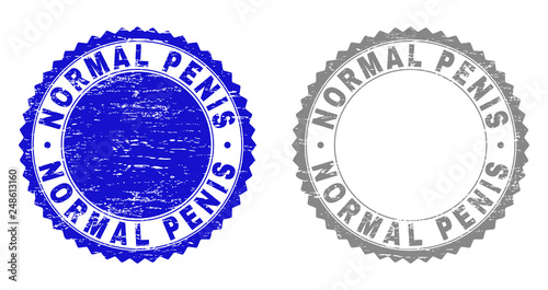 Grunge NORMAL PENIS stamp seals isolated on a white background. Rosette seals with grunge texture in blue and gray colors. Vector rubber watermark of NORMAL PENIS text inside round rosette.