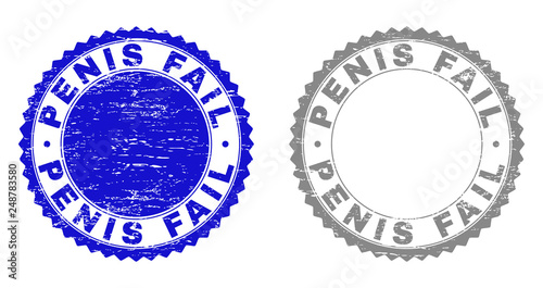 Grunge PENIS FAIL stamp seals isolated on a white background. Rosette seals with grunge texture in blue and gray colors. Vector rubber stamp imprint of PENIS FAIL tag inside round rosette.