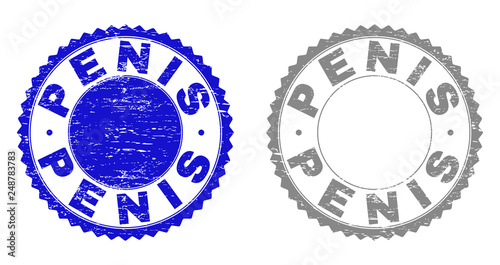 Grunge PENIS stamp seals isolated on a white background. Rosette seals with grunge texture in blue and gray colors. Vector rubber stamp imitation of PENIS title inside round rosette.
