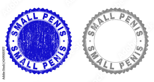 Grunge SMALL PENIS stamp seals isolated on a white background. Rosette seals with grunge texture in blue and gray colors. Vector rubber stamp imitation of SMALL PENIS title inside round rosette.