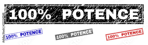 Grunge 100% POTENCE rectangle stamp seals isolated on a white background. Rectangular seals with grunge texture in red, blue, black and grey colors.