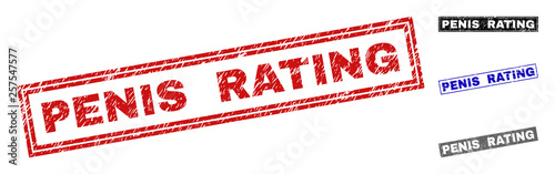 Grunge PENIS RATING rectangle stamp seals isolated on a white background. Rectangular seals with grunge texture in red, blue, black and gray colors.
