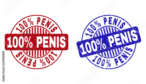 Grunge 100% PENIS round stamp seals isolated on a white background. Round seals with grunge texture in red and blue colors. Vector rubber overlay of 100% PENIS tag inside circle form with stripes.