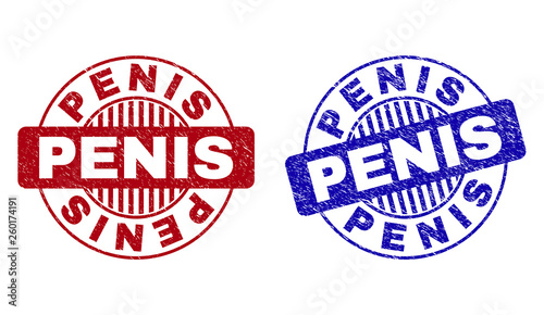 Grunge PENIS round stamp seals isolated on a white background. Round seals with grunge texture in red and blue colors. Vector rubber watermark of PENIS caption inside circle form with stripes.