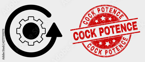 Vector gear rotation pictogram and Cock Potence seal stamp. Red rounded grunge seal stamp with Cock Potence text. Vector combination for gear rotation in flat style. Black isolated gear rotation icon.