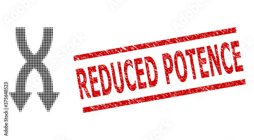 Shuffle arrows down halftone dotted vector and Reduced Potence textured stamp seal. Stamp seal includes Reduced Potence caption between parallel lines.