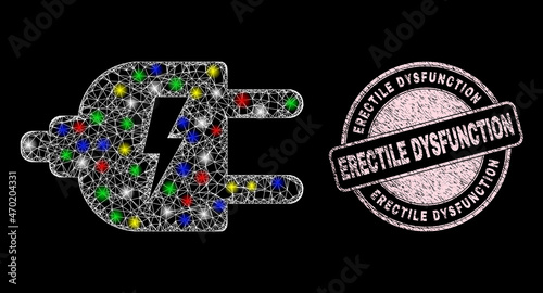 Glossy hatched network electric source icon with glitter effect on a black background with Erectile Dysfunction grunge seal imitation. Pink seal includes Erectile Dysfunction text inside round shape.