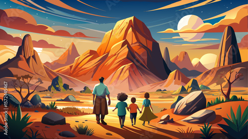 A family enjoying a peaceful moment amid the striking granite peaks of Spitzkoppe, Namibia. Surrounded by dramatic rock formations and golden desert light