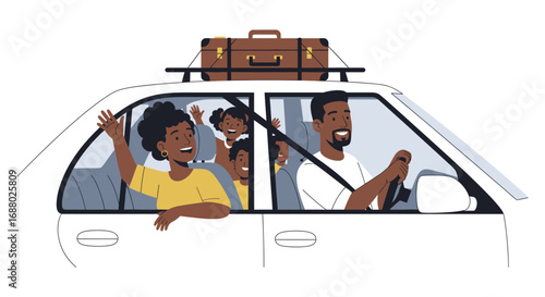 Happy African American Family Waving from Car on Road Trip with Luggage.