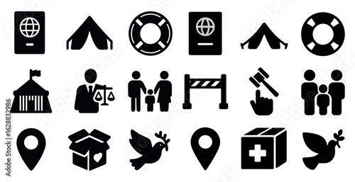 Travel and safety icons set in solid style – emergency, security, family symbols