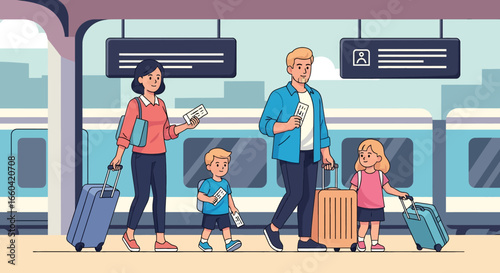Vector illustration of a family with luggage and tickets at a train station, symbolizing travel, vacation, family trip, and modern transportation