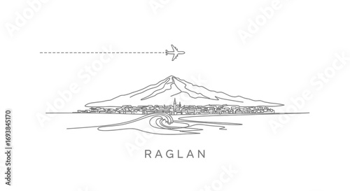 Raglan with New Zealand Minimalist line art of town  mountain.