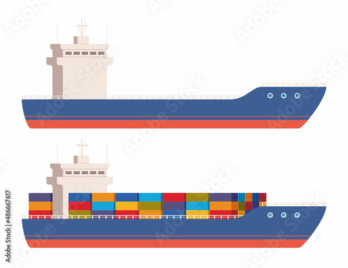 Vector illustration of a shipyard with cranes heavy machinery and equipment. Cargo Ship at Industrial Port with Cranes and Containers