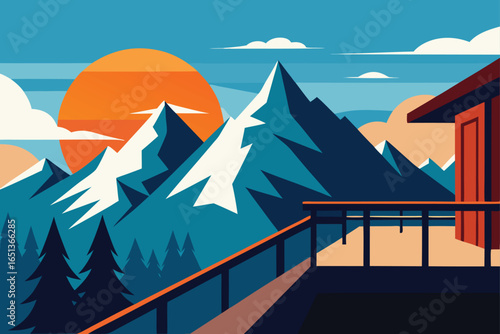 Coastal Town at Sunset Mediterranean Style Illustration Vintage Travel Poster Design.