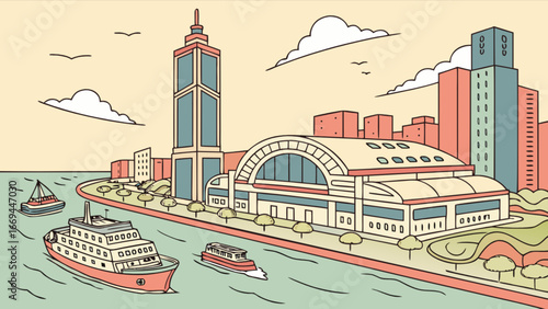 Industrial port scene with ships trucks and power lines hand-drawn style collage