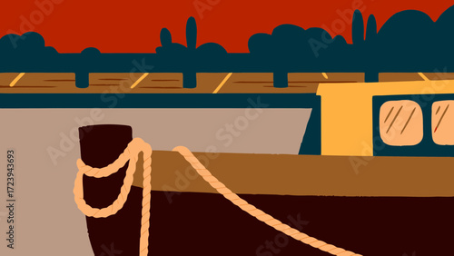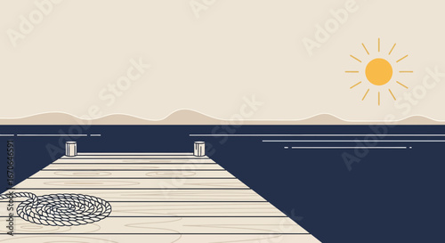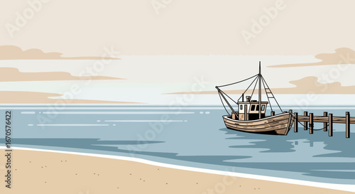 Vector illustration of sailboats docked on calm water with reflections. Peaceful nautical scene with boats of various sizes under a serene sky. Perfect for marine and coastal designs