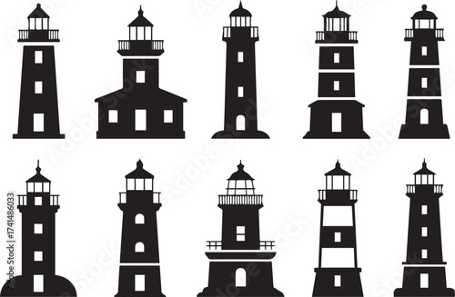 Lighthouses icons set. Nautical navigation light tower. Marine seaside architecture. Beacon and symbol of seamark. Simple black and white flat style isolated vector clipart collection