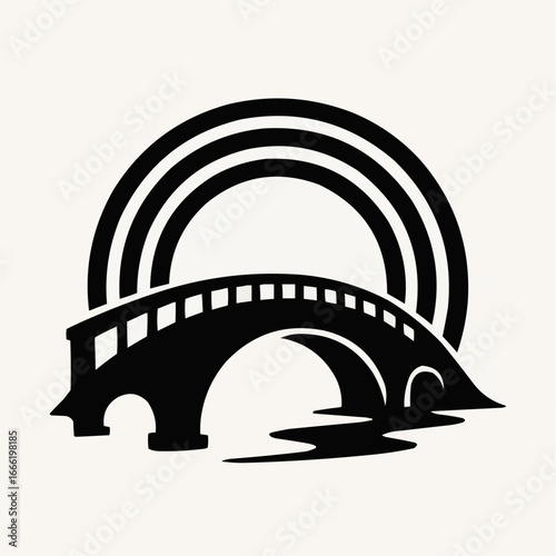 Silhouette of a city skyline with buildings, bridge, boat, and bird in black and white illustration created with generated ai