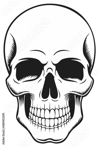 Detailed graphic hand drawn realistic black and white angry human skull with open jaw. Trash polka style. On white background. Vector icon.