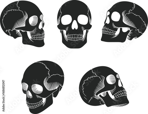 Detailed graphic realistic cool white human skulls with crazy eyes and lower jaws. On gray background. Vector icon set.