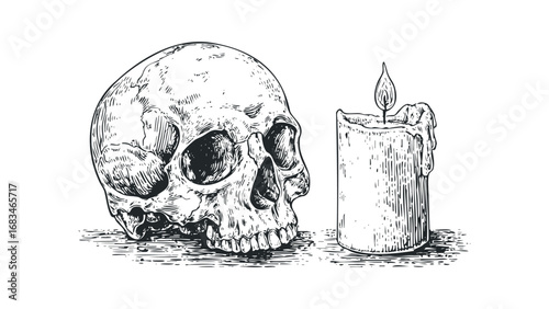 Vintage monochrome human skull with arrow isolated on white background. Hand drawn design element template for emblem, print, cover, poster. Vector illustration.