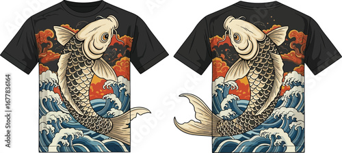 Koi carp with japanese waves. Vector illustration. Tattoo print. Hand drawn illustration for t-shirt print, fabric and other uses.