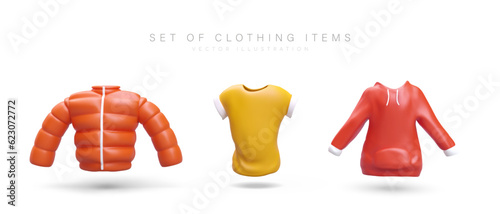 Set of color clothes images. 3D padded jacket, t shirt, hoodie. Womens and mens clothing for different seasons. Modern fashion, daily outfit. Isolated vector symbols