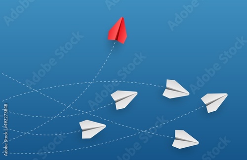 Different business concept.Red paper plane changing direction from white paper plane. new ideas. paper art style. creative idea. vector ,illustration.