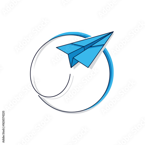 Soaring blue paper airplane, leaving a dotted trail, embodies playful flight and simple design, a vibrant vector illustration perfect for minimalist concepts.