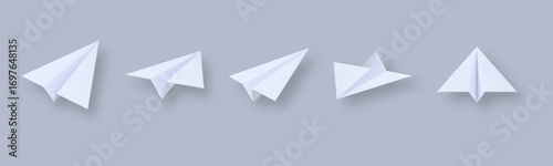 Paper plane 3d models in different angles on white background. Realistic light blue origami aircrafts. Clean minimal folded sheet objects for education, childhood concepts or travel metaphors.