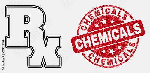 Vector linear Rx symbol pictogram and Chemicals seal. Blue round scratched seal stamp with Chemicals phrase. Black isolated Rx symbol pictogram in linear style.