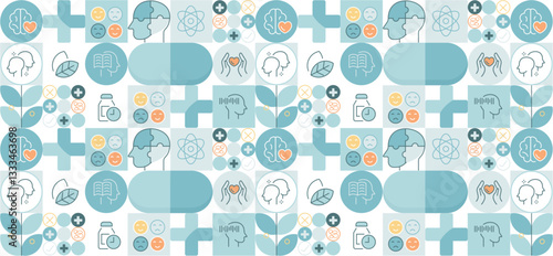 Mental health with icons. meditation, stress management, anxiety, relief, depression stress, psychology, brain and more. Illustrated with a blue pattern health shapes. vector design.