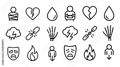 Mental Health icon set with anxiety, depression, stress, therapy, counseling, psychologist, psychiatrist, mental illness, emotional well-being icon. Simple handdrawn vector