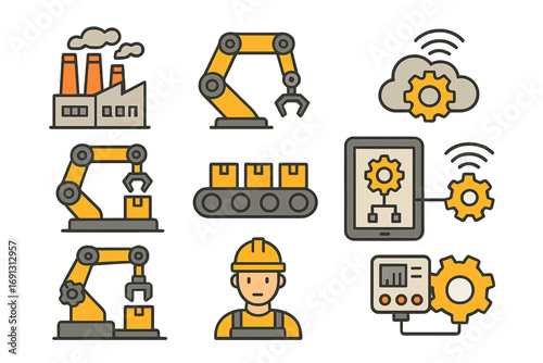 Industrial Tool Icons Set – Robotic Arm, Lathe, Hard Hat & Equipment Symbols – High Quality Stock Icons