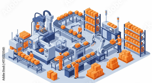 Adobe Illustrator vector flat style illustration of an isometric automated warehouse and factory, showcasing robotic arms, conveyor belts, and shelves with boxes for logistics and production