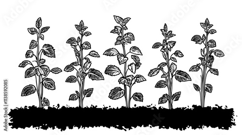 Mint plants spreading in the corner of a raised garden bed, Vectorized Plant Art